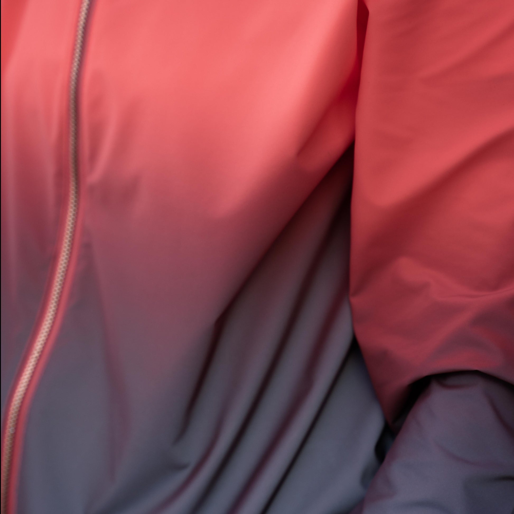 Inspired by the sunset, this jacket features a stunning ombre effect, transitioning from neon coral to reflective grey. In daylight, the core shines pink-purple, while at nightfall, the mid-tones mix into taupe, mauve, and shimmering grey. Finished with a matching rose gold zipper and an elegant pull tab, this jacket reflects from top to bottom in the dark.