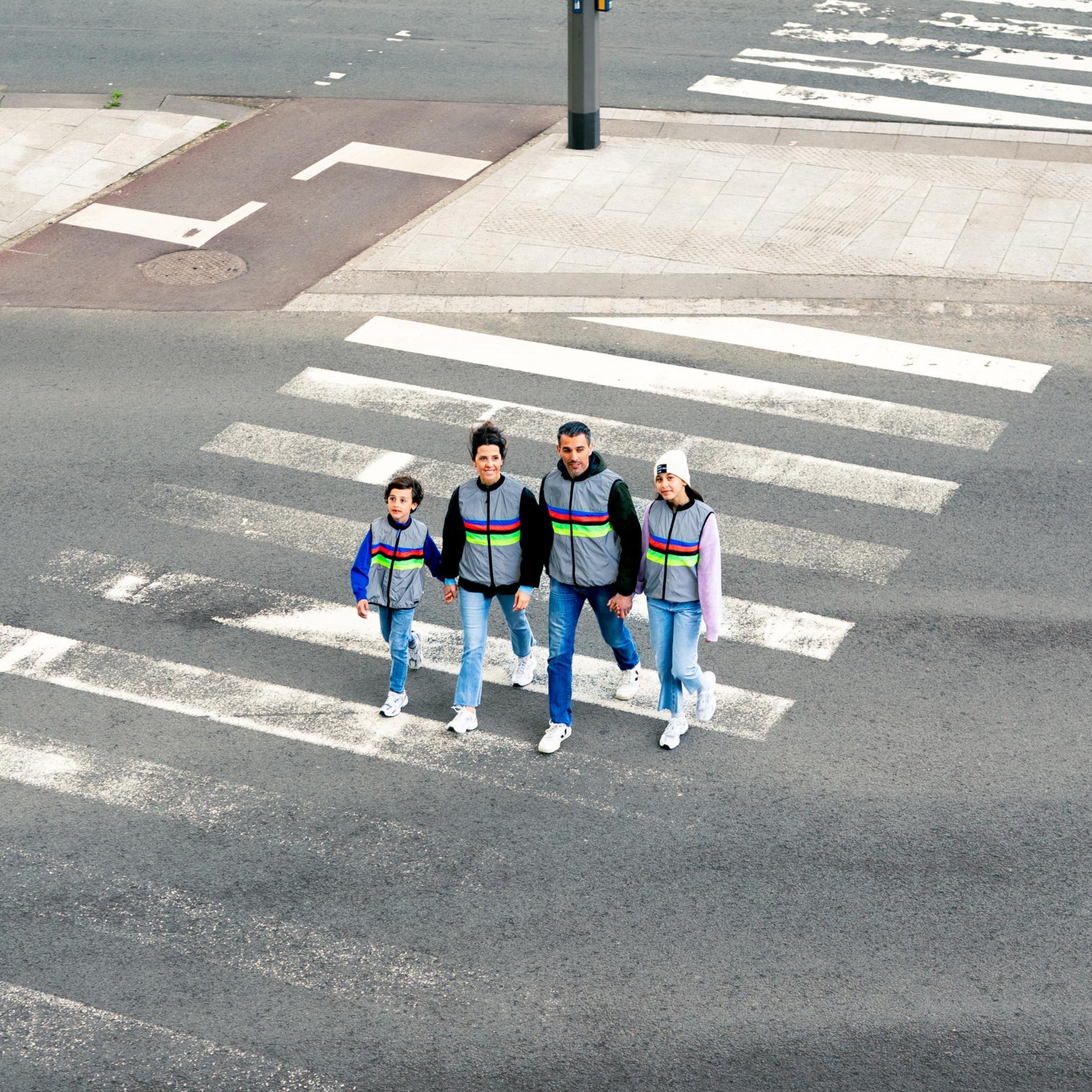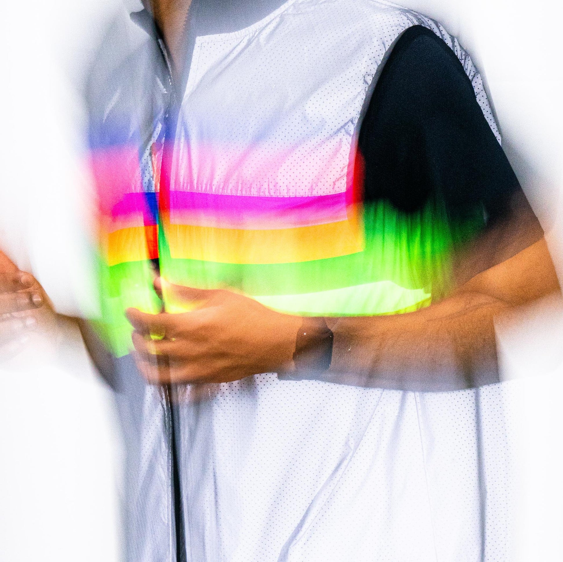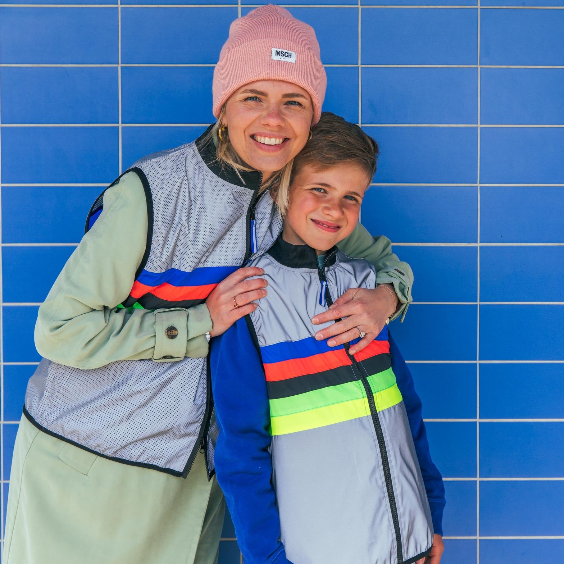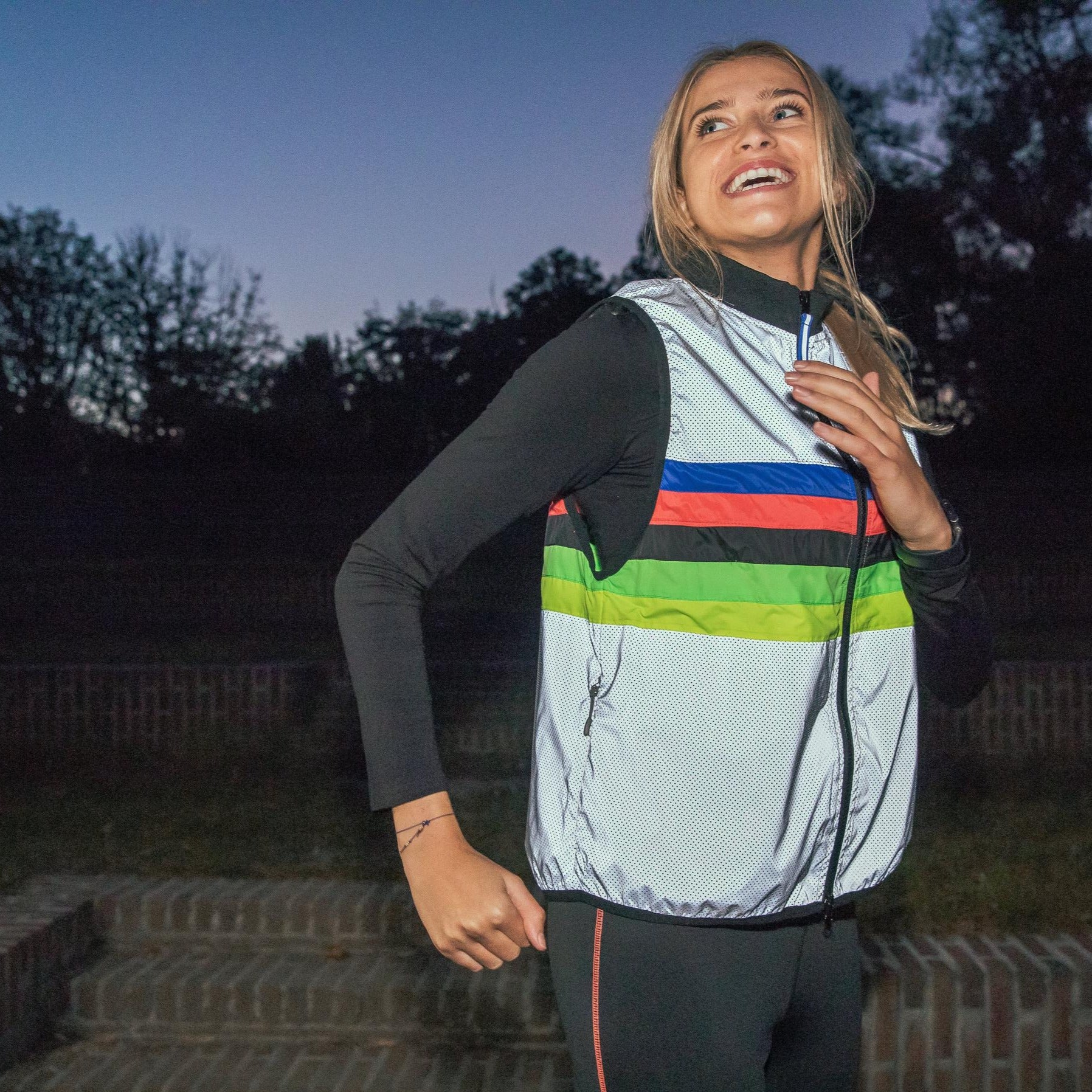 Inspired by the iconic rainbow jersey of cycling champions, this statement piece ensures you stand out during the day with its vibrant colors and reflects your visibility at night with its reflective fabric.