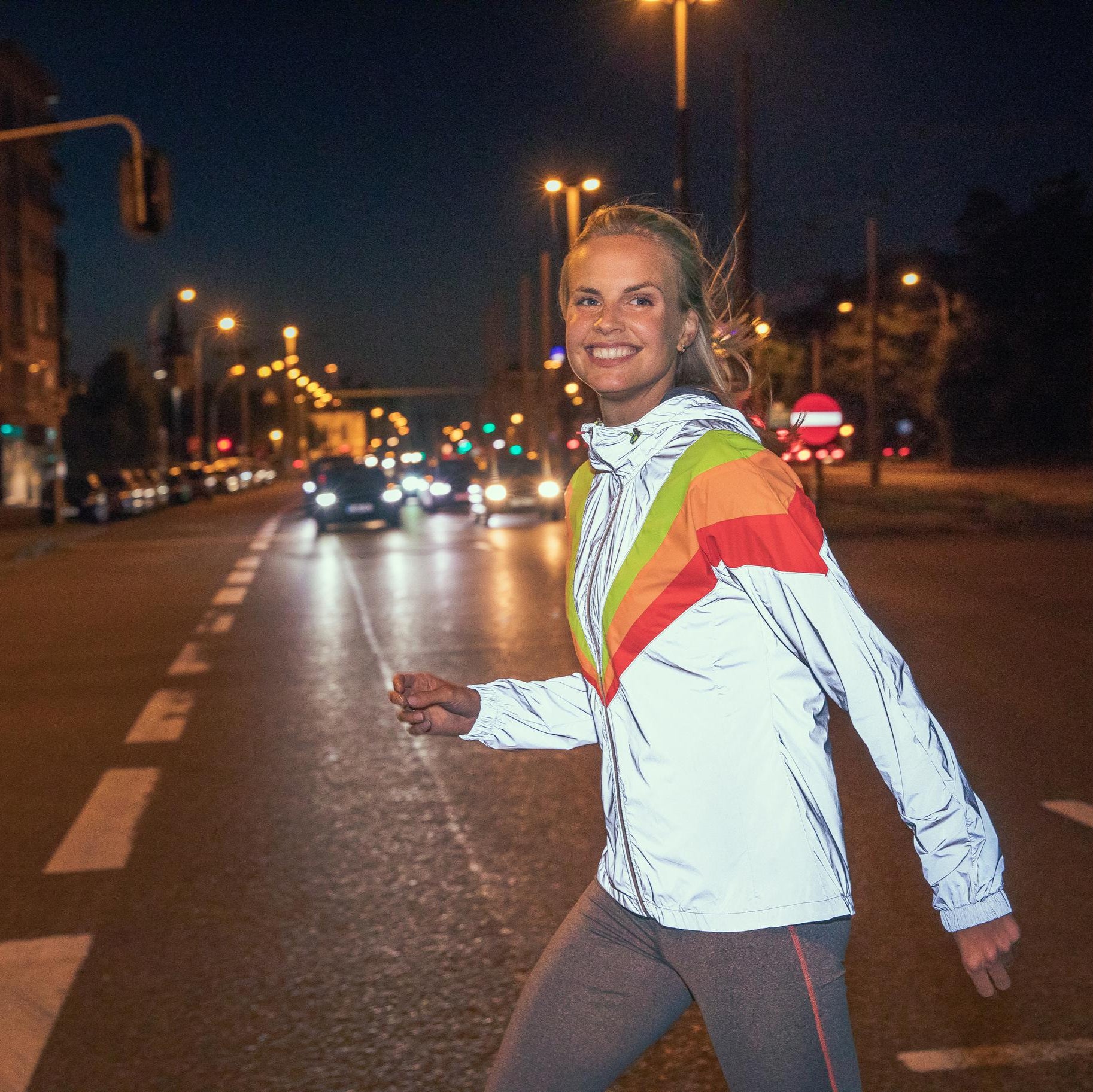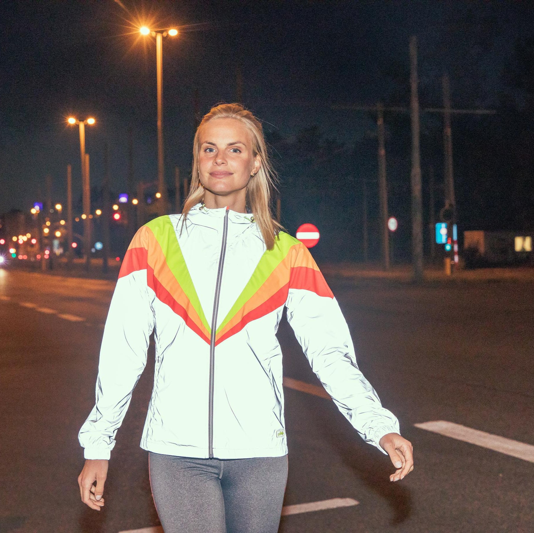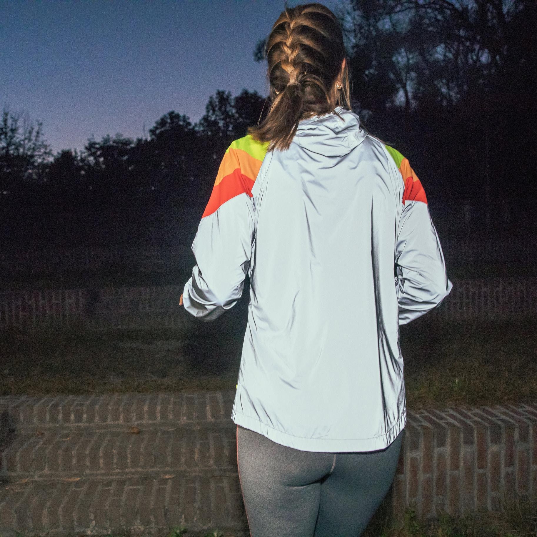 featuring vibrant rainbow colors, you'll stand out during the day, while the reflective fabric ensures you shine bright at night. perfect for daily commutes, this jacket is designed with a longer back, hoodie, and two sideseam pockets to hold your phone or keys. the auto-lock zipper closure ensures stability during runs, and the fitted silhouette creates a feminine look.