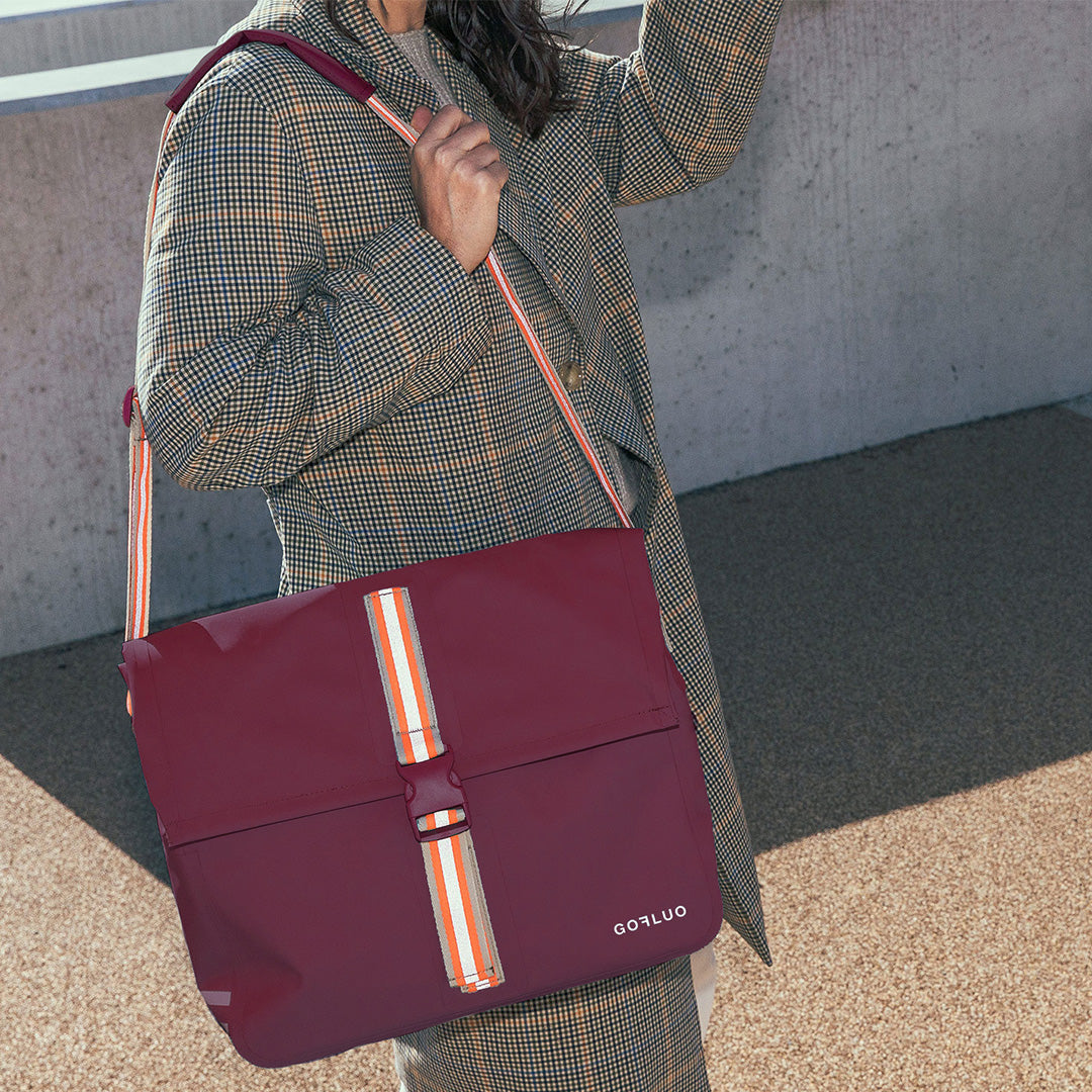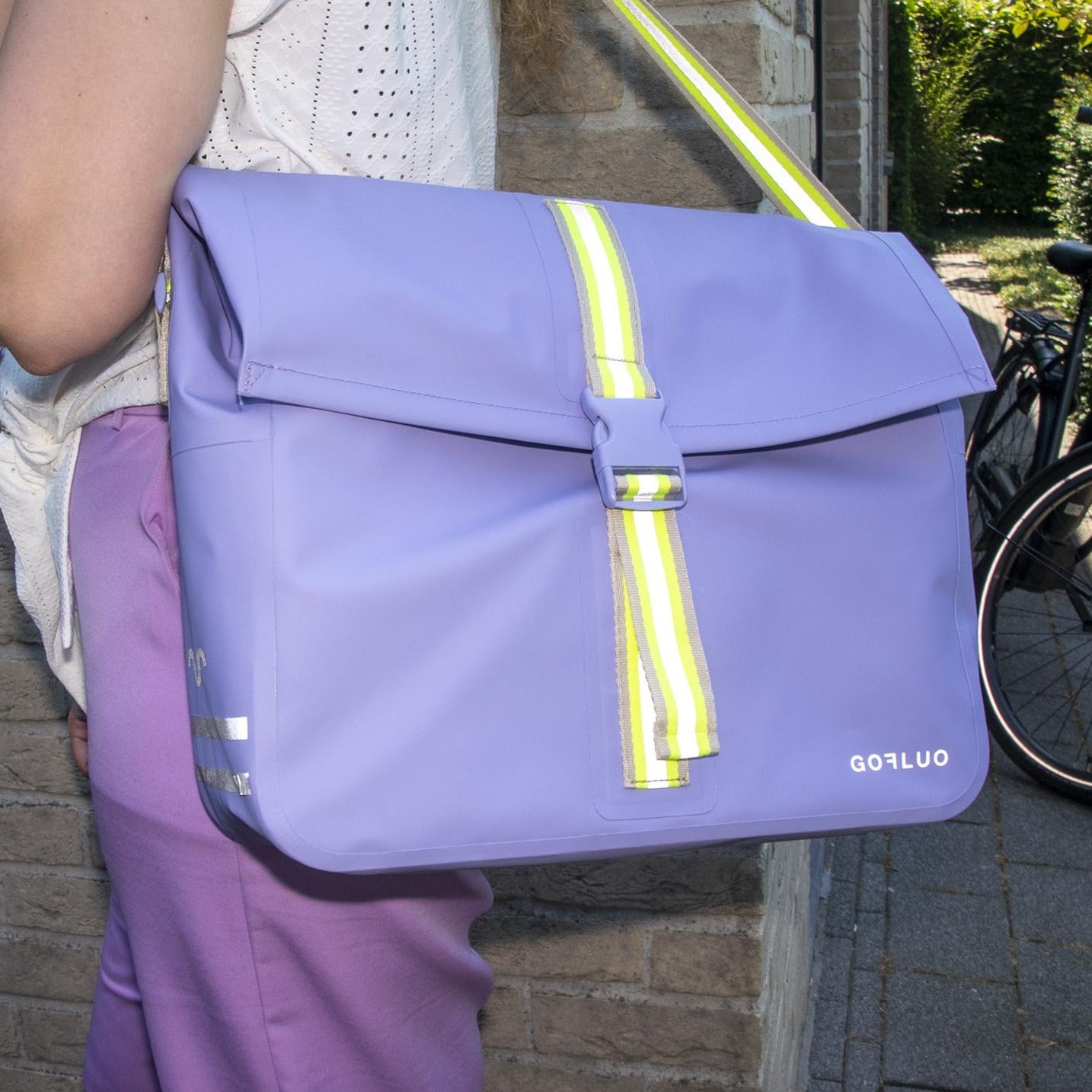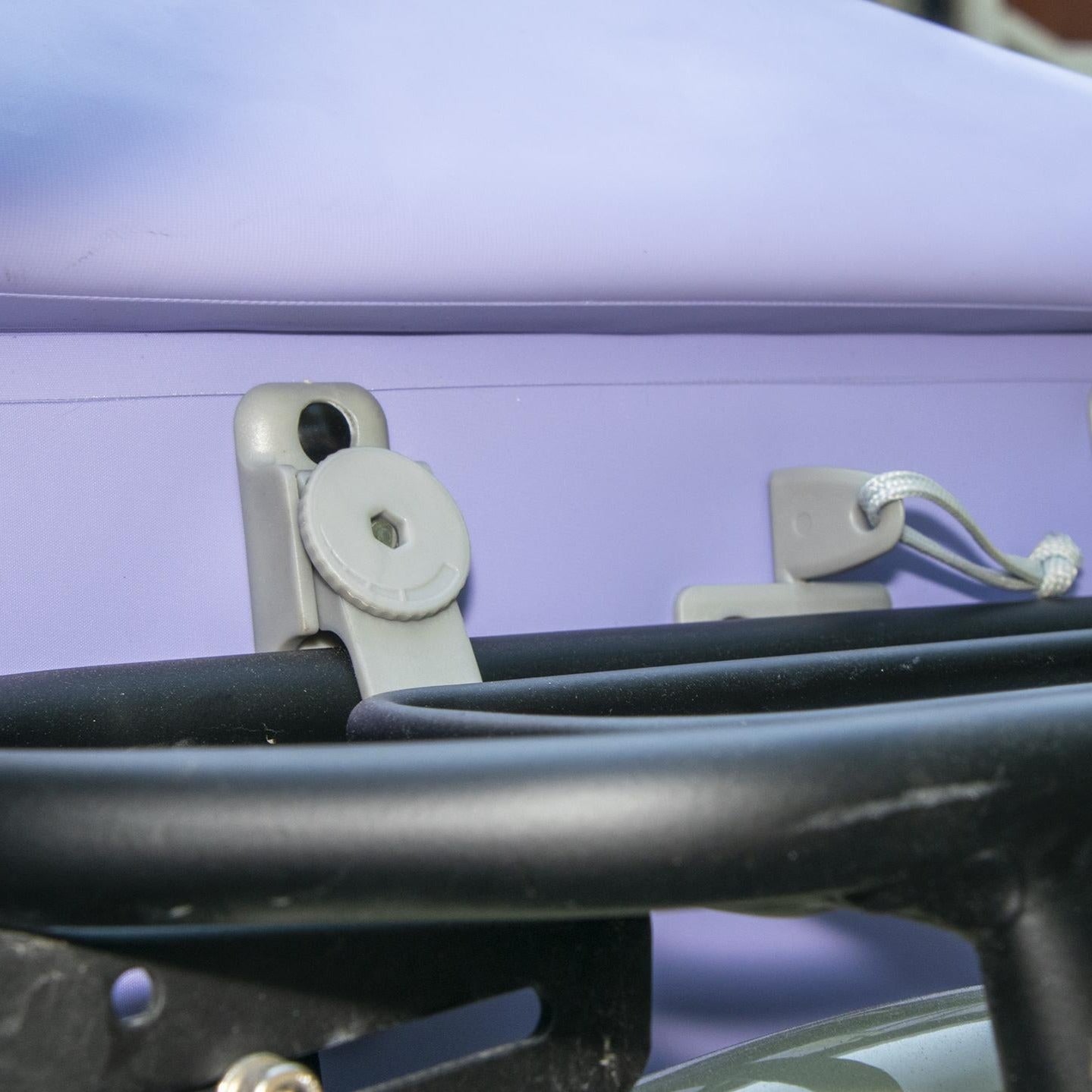 Crafted from waterproof fabric with taped seams, this bag ensures your belongings stay dry in the rain. The adjustable clip-on system ensures a secure fit for any bike rack—simply turn the wheels to size the attachment clips and easily clip the bag on or off. For added stability while riding, pull the middle loop towards you to keep the bag securely in place. When you're off the bike, use the shoulder strap that folds neatly into the main compartment for easy carrying.